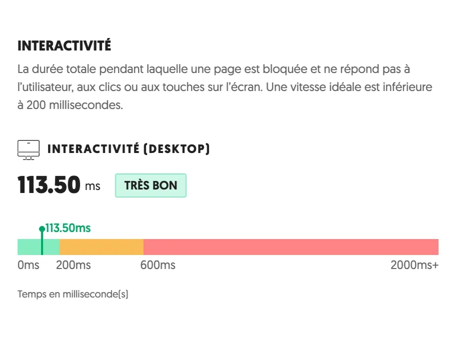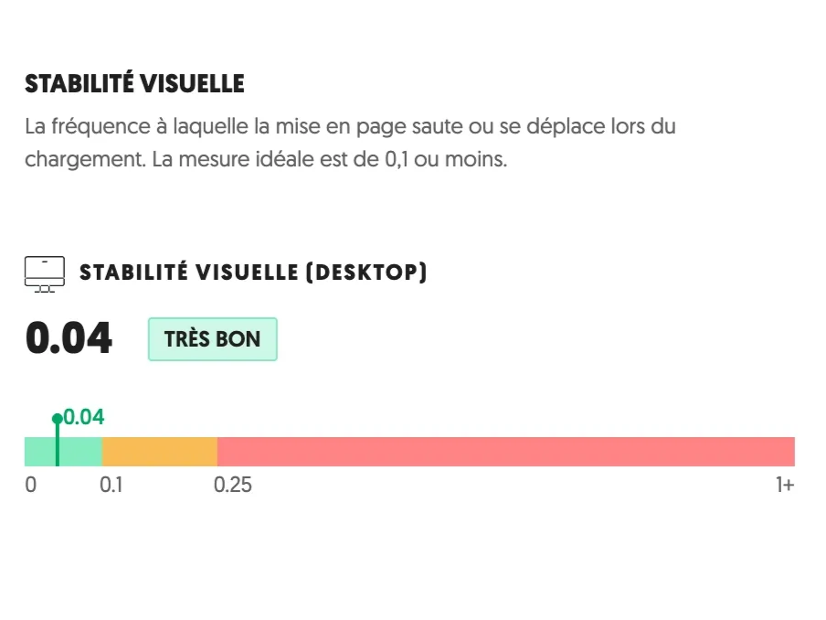 Un site rapide et une expérience utilisateur fluide sont essentiels à la santé de votre SEO. Sur la base des expériences visiteurs réelles sur votre site ces 28 derniers jours, nous avons déterminé le temps de chargement de vos pages, le temps d'attente des visiteurs lors de l'interaction avec vos pages et l'instabilité de vos pages lors du chargement.
